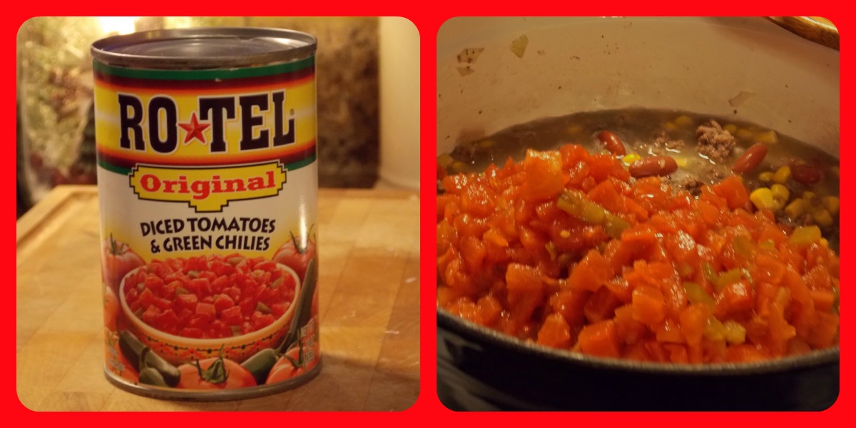| Add one can of whole kernel corn (undrained) and one can of kidney beans (undrained) I have also used black beans instead of kidney beans if I am out at the time. |
